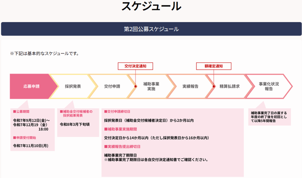 補助金の申請から交付までの流れは、非常にタイトなスケジュールで進行します。計画的な準備が不可欠です。